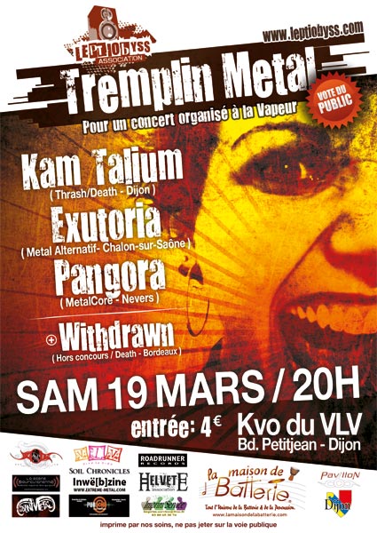 | Autres infos | Venez voter pour l'un des trois groupes en lice pour le concert à la Vapeur qui se déroulera le samedi 11 juin avec deux groupes de renoms (qui vous seront dévoilés au tout début du concert)... PANGORA --> http://www.myspace.com/pangorametal KAM TALIUM --> http://www.myspace.com/kamtaliumband EXUTORIA --> http://www.myspace.com/exutoria Les Bordelais de Withdrawn ouvriront le début des hostilités !!! WITHDRAWN --> http://www.myspace.com/withdrawn1 |