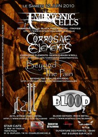 | Autres infos | EMBRYONIC CELLS : Vétérans de la scène, EMBRYONIC CELLS (déjà 2 albums à leur actif !), viendrons asséner un concentré de thrash rageur combiné avec un black-métal puissant et épique. JOIN US, YOUR LORD IS AZATHOTH !!! http://myspace.com/embryoniccells CORROSIVE ELEMENTS : Blablablabla DEATH THRASH N’ROLL, THE OLD SCHOOL WAY! Blablablabla Blablablabla Blablablabla Blablablabla Blablablabla Blablablabla Blablablabla Blablablabla ! http://myspace.com/corrosiveelementsofficial BEYOND THE PAIN : Après plusieurs expériences musicales et leur rencontre grâce à Garden Of Sins en 2007, Finnarian, Ashes et Polo décident de se retrouver autour d’un nouveau projet métal mêlant leurs diverses influences, à la fois death, progressives et mélodiques. Arnold, Eira et Shad les rejoignent très vite et les compositions s'enchainent. http://www.myspace.com/beyondthepainmusic ACYL : A la croisée du metal et de la world music, ACYL propose une musique métissée et riche. La rencontre entre des riffs lourds, techniques et modernes avec des mélodies et rythmes traditionnels maghrébins. Une musique qui demande un esprit ouvert et un goût pour l’expérimentation. http://www.myspace.com/acylband BLOOD OXYGEN : Projet évoluant entre rock et metal, BLOOD OXYGEN, est né d’une volonté de jouer une musique libre par des membres et ex-membres du groupe Kortex. A découvrir absolument ! http://www.myspace.com/bloodo2 Le Star Café 15, Rue du théatre 75015 Paris 8 euros sur place. Ouverture des portes 18h00 Métro: L6: DUPLEIX - L10: CHARLES MICHELS |