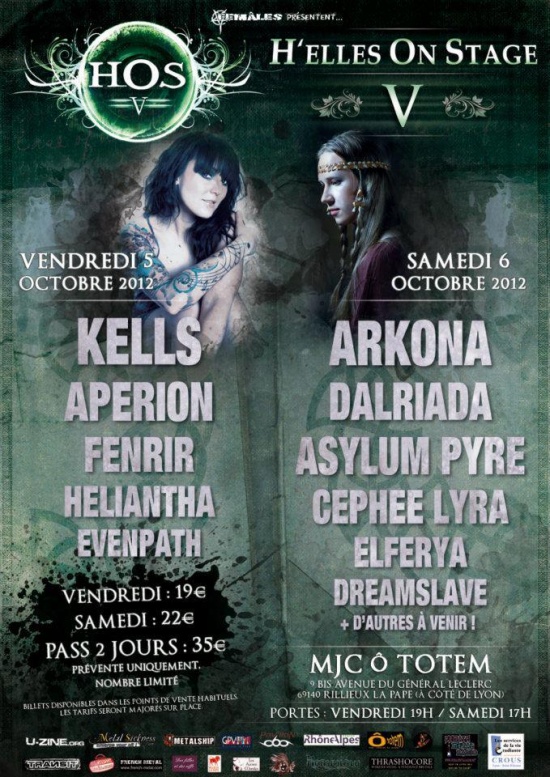 | Autres infos | (présentation prise sur le myspace officiel) Pour ses 5 ans le H'elles On Stage passe sur 2 jours, les 5 et 6 octobre 2012 à la MJC Ô Totem (69) et l'Association Femâles a le plaisir de vous en révéler l'affiche ! Vendredi 5 octobre : KELLS / APERION / FENRIR / HELIANTHA / EVENPATH - 19h Samedi 6 octobre: ARKONA / DALRIADA(+ guests) / ASYLUM PYRE / CEPHEE LYRA / ELFERYA / DREAMSLAVE - 17h >> PASS 2 JOURS à 35€ - Uniquement sur prévente et en nombre limité ! << Autres tarifs : - vendredi 19€ en prévente / 23€ sur place - samedi 22€ en prévente / 26€ sur place Un tarif étudiant en prévente est également disponible. Places en vente : Fnac : http://www.fnacspectacles.com/recherche/rechercheRapide.do?search=h%27elles+on+stage Sur le site de la MJC : http://www.weezevent.com/multibilletteries/billetterie-mjc-rillieux/index.php A venir sur Digitick et Ticketnet Adresse : MJC Ô Totem - 9 bis avenue Général Leclerc, 69140 Rillieux-la-Pape Infos : • www.hellesonstage.com • www.facebook.com/HellesOnStageFestival Contact : femalesasso@live.fr |