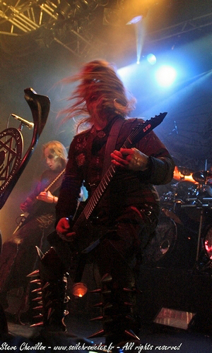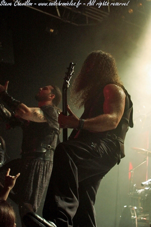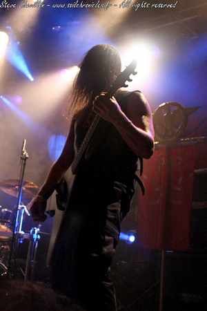 A peine le temps de régler mon appareil photo, que les lumières s’éteignent, et qu’une intro digne d’un péplum vient titiller mes oreilles. Ex Deo envahit les planches, armure sur le dos, et commence son show. Le groupe canadien nous offre un death bien plaisant, avec la bonne idée de s’inspirer de l’antiquité romaine, dans les samples, les paroles et les intros. Ceci, en plus de fournir à leur musique un côté épique, permet à la formation de se démarquer des groupes de métal folk et viking. Tirant plus du côté d’Obelix pour la force brute, ils n’oublient donc pas d’apporter une touche d’Asterix. Les morceaux semblent assez longs, avec quelques passages plus « aérés », et le tout n’est pas déplaisant. Le chanteur Maurizio Iacono , francophone, blague avec le public, faisant référence aux personnages de la bande dessinée par deux fois, rigolant aux « Enlève ta jupe! » de certains… Néanmoins, on a un peu l’impression que c’est lui qui porte tout le groupe sur ses épaules, car les musiciens, hormis le headbang de rigueur et quelques joyeusetés, restent un brin trop concentrés sur leurs instruments. Malgré cela, le set reste très qualitatif, aidé par un bon son. Mais un peu court pour moi. J’aurais bien pris un morceau de plus. Si César avait du motiver ses troupes avec de la musique, nul doute qu’il aurait choisi Ex Deo!