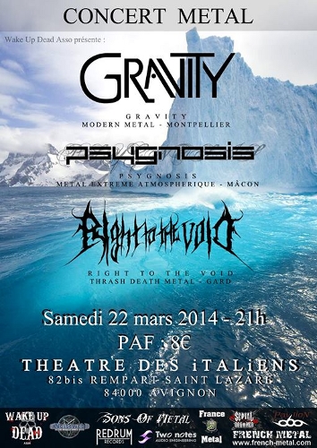 Deux semaines après le premier concert – réussi – en Avignon intra muros, le Théâtre des Italiens nous remet ça. Et un concert à dix minutes à pied de la maison, ça ne se refuse pas ! Surtout que ce soir, c’est avec Right to the Void, Psygnosis et Gravity, trois groupes que je connais déjà. Alors bravons la pluie et allons se faire chauffer les tympans !