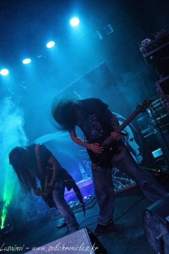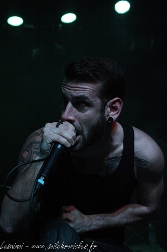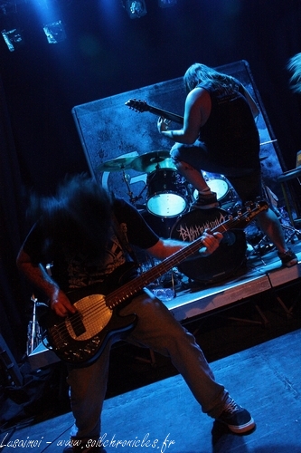 Et là… holy fuck ! C’est certainement ma plus grosse claque depuis un moment ! Déjà, j’avais reçu leur CD, Human Be[ing] (chroniqué par Celtikwar), sorti tout tout tout récemment, et je m’étais pris une bonne baffe, mais là ! Il a suffit de l’intro, des premiers riffs de guitares et les headbangs furieux qui vont avec, pour m’emporter totalement. Mais ce jeu de scène, justement, ce n’est pas qu’un jeu de scène. Rien que voir Yohan, le chanteur – à l’aise aussi bien dans les hurlements que dans le chant clair, même si quelques petits détails se faisaient parfois entendre –, totalement possédé. Le groupe ne joue pas, il vit vraiment sa musique. Musique qui n’est pas non plus des plus simples. Ce très personnel Death Progressif mâtiné d’Indus, avec boîte-à-rythme et pas mal de samples de films, multiplie les plans différents, n’hésitant pas à allier des passages sereins, ambiants, à d’autres nettement plus violents (un peu à la manière d’un Hypno5e, mais pas en tout à fait pareil), pour des morceaux dépassant souvent les dix minutes. Et, aussi bien lors des passages extrêmes que durant les « pauses », on a une interprétation en direct par le quatuor. Et pourtant, il n’y a pas de fioriture, rien, ou presque, sinon les membres du groupe.