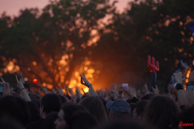 Je surfe habilement entre les frites et les glaces italiennes. Allez, j’avoue m’être jetée sur un cornet pistache-chocolat géant de toute première qualité, bonne idée de la part de l’orga d’avoir invité les glaces metal sur le site, la température se faisant changeante en fonction de l’apparition ou non du soleil. Cramés sous le soleil, grelottant à l’ombre, il a fallu être solide. On ne compte pas les épisodes pluvieux qui ont vite fait bien fait de rincer les 20000 corbeaux présents sur le site chaque jour. C’est le festival de toutes les météos !