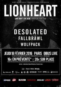 Plus on s’approche de Lionheart, moins les chanteurs sont habillés, avec un Paul qui a froid à la tête (surmontée d’un bonnet et pas n’importe lequel : celui de Fallbrawl) mais visiblement pas au torse (démuni de tout tatouage… petit joueur). Desolated se ramène aussi pour nous présenter leur nouvel album sorti il y a 3 mois, The End, plus hardcore que son prédécesseur full-lenght « Verses Of Judas », et qui est bien meilleur d’ailleurs (avec une pochette à la Stoner bizarrement). Notons la progression du Deathcore (à ses débuts avec The Birth Of Corruption) au Hardcore qu’a connu le groupe. On ne dirait pas le même groupe d’ailleurs en comparant leurs premiers EP et album, et les derniers. En tout cas si vous avez cru sous-estimer l’énergie vocale, corporelle et l’endurance de ce frontman à première vue, la bête est bien enragée ! Lorsqu’il tient un micro, se trouve sur scène, et lorsque le public est à fond surtout, ça l’excite encore plus ! Certains connaissaient même une partie des paroles et ont même pu hurler dans le micro que Paul leur tendait généreusement (histoire de souffler un peu aussi).