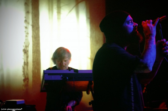 Les loups s’apprêtent à envahir les lieux… Daniel O’ Sulivan en tête, bouteille de rouge en bouche, suivi de Garm, puis des autres musiciens, armés eux aussi de leurs bouteilles ! On peut apprécier dans un premier temps les lumières qui pour une fois dans un concert metal ne sont pas criarde et changeantes, un éclairage doux légèrement bleu, parfois rouge. La scène est également mise à jour par l’écran qui diffuse comme au Hellfest, des vidéos genre d’artiste post-expressionniste, drame, mort, tempête et psyché… douce mélancolie, qui reste fort agréable et passe très bien en second plan de la musique tout en ne s’ exposant pas aux habituels clichés de ce genre de concept. Ouverture sur « Febury MMX », mise en bouche du dernier album histoire de nous annoncer la couleur, un son assez rock, mais on ne peut pas s’y tromper c’est bien de l’Ulver!! Un concert de Ulver c’est magique … musicalement ça pourrait très bien se jouer devant un tout autre public … qu’il faudrait le chercher pour savoir Ulver sort du fond de la Norvège black metal. Il en est qu’Ulver est un concentré d’émotions, de rage et de passion, toutes ces énergies puisées dans le black metal, mais composé différemment et avec intelligence. Un public majoritairement metal qui adopte pourtant un comportement tout à fait différent : silencieux, contemplatif, les larmes ne sont pas très loin…c’est simplement à la dernière note que les applaudissements retentiront dans la salle. Comme si nous étions dans une espèce de cérémonie d’un autre type, ou possédés ici par la musique. De plus les musiciens sont excellents, Garm a une voix unique et magnifique, qu’il maîtrise parfaitement sur scène, il sera aussi le chef d’orchestre du futur derrière sa table ou il travaille entre tables de mixage et autres, ainsi que son Ipad avec lequel il dansera à plusieurs reprise pour rythmer le son, son visage éclairé par l’appareil. Il sera également accompagné par deux autres personnes pour les sons, on peut d’ailleurs constater la présence d’un de ses anciens musiciens derrière les tables de mixage. Garm se place tout de fois comme étant le personnage principal de cette pièce, secondé de prés par Daniel O’Sulivan qui lui semble être tout droit sortie des années 70, alternant avec élégance guitare, basse, piano et chant. Scéniquement les autres musiciens sont plus placés en figurants, mais avec un talent tout aussi significatif. Le batteur est excellent, un très bon feeling et une subtilité tout à fait en accord avec Ulver. On peut aussi remarquer que les musiciens sont peu communicatifs avec le public, mais j’ai envie de dire que ce n’est pas utile, ils ont la capacité de le faire avec la musique. Un tout petit bémol viendra du son de la salle, qui lorsque l’on se place devant la scène, les basses sont légèrement écrasées mais d’une manière générale le son est bon. L’heure du dernier morceau arrive trop vite … Il s’agira de « Stone Anglels », un morceau de 15minutes, un final majestueux, avec Daniel O’Sulivan au piano, lisant un poème soutenu par une ambiance funèbre à la fois pesante et apaisante. Comme s’ils voulaient nous entraîner à la fin de se set, comme dans une petite mort…. Ce morceau nous fait trembler, frissonner … 1h de concert et tout de même un rappel, avec « allways of always » (Perdition city). Un morceau incontournable sur scène, avec des beats plus électro que l’album que l’on vient de découvrir. Ce morceau que tous les amateurs connaissent, vient subliment nous réanimer du voyage « Wars of roses » et nous donner envie de plus les quitter… Mais les lumières vont s’éteindre… les messieurs vont simplement nous saluer et partir…