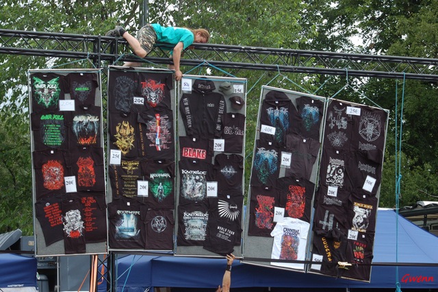 L’après midi arrive vite, et je récupère mon accréditation toujours affublée de mon sac à main plus gros que moi. Quelle horreur, ce sac, il m’avait semblé y avoir mis uniquement mon matériel et deux trois fringues, ça fait 25 kilos ça n’est pas logique. Passons. Le site du festival est en effet moins grand que celui du Hellfest, la Mainstage aussi mais elle est très sympa, bien équilibrée et assez profonde. Deux tentes, la « Sue » et la « Inferno » délimitent le site, bien placées. Je trouve rapidement un vestiaire pour mon sac et m’en vais découvrir l’espace Presse, les raccourcis, la structure du site qui le l’avoue est vraiment bien fichue.