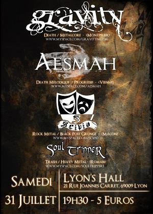 Et pourtant, pour les amateurs de formations en devenir, l’affiche de la soirée était pour le moins alléchante, avec Gravity en tête d’affiche, descendu de Montpellier pour nous présenter son death-core, puis Aesmah (death-mélodique, Vienne) et Scipio (rock-metal, Mâcon).
