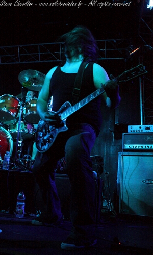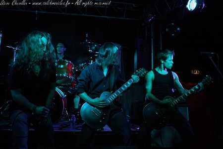 C’est au tour des Bourguignons de Scipio de faire parler la poudre et c’est prêts à en découdre qu’ils investissent les planches du Lyon’s Hall. Le heavy-thrash fait maintenant place à un heavy-rock puissant et sévèrement burné. Emmené par une paire de guitaristes alternant parties leads et grosses rythmiques, le groupe peut aussi compter sur un chanteur, certes un brin poseur, mais de bon niveau sachant se démerder aussi bien en screams et autres borgorismes qu’en chant clair lorsque les grattes décident de calmer le tempo le temps de quelques arpèges acoustiques. Même si nous sommes loin de l’affluence des grands jours, le public sort doucement de sa torpeur et se lance dans du secouage de tignasse au son des anciens titres et des plus récents issus de « My King« , le premier album des mâconnais. Le groupe terminera sa prestation de bonne qualité sur une touche d’originalité, le temps d’un final complètement barré.