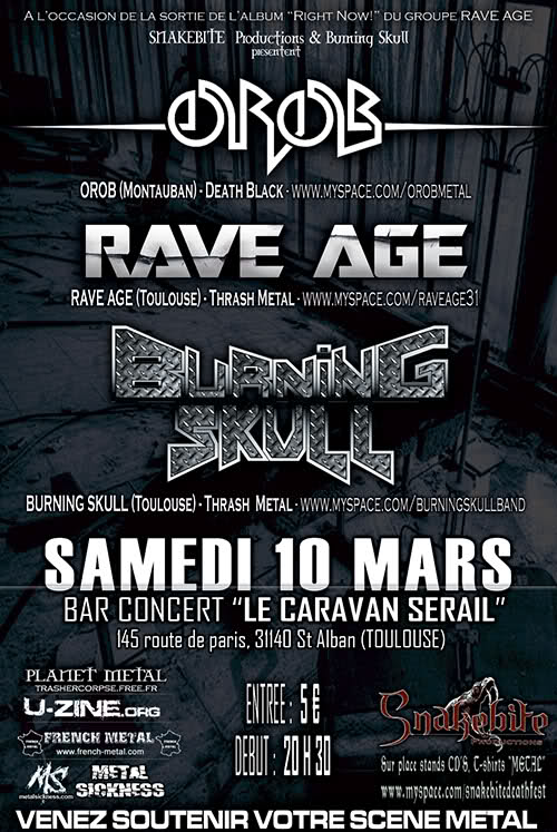 Qui dit Snakebite Prod dit concert metal, qui dit concert Metal organisé par Snakebite dit assurance d’une bonne soirée. Ce samedi 10 Mars 2012, Fab et ses joyeux compères ont décidé d’implanter leur campement au Caravan Serail (31). Leurs trois bataillons qui sont montés sur les planches ce soir-là furent BURNING SKULL, RAVE AGE et OROB.