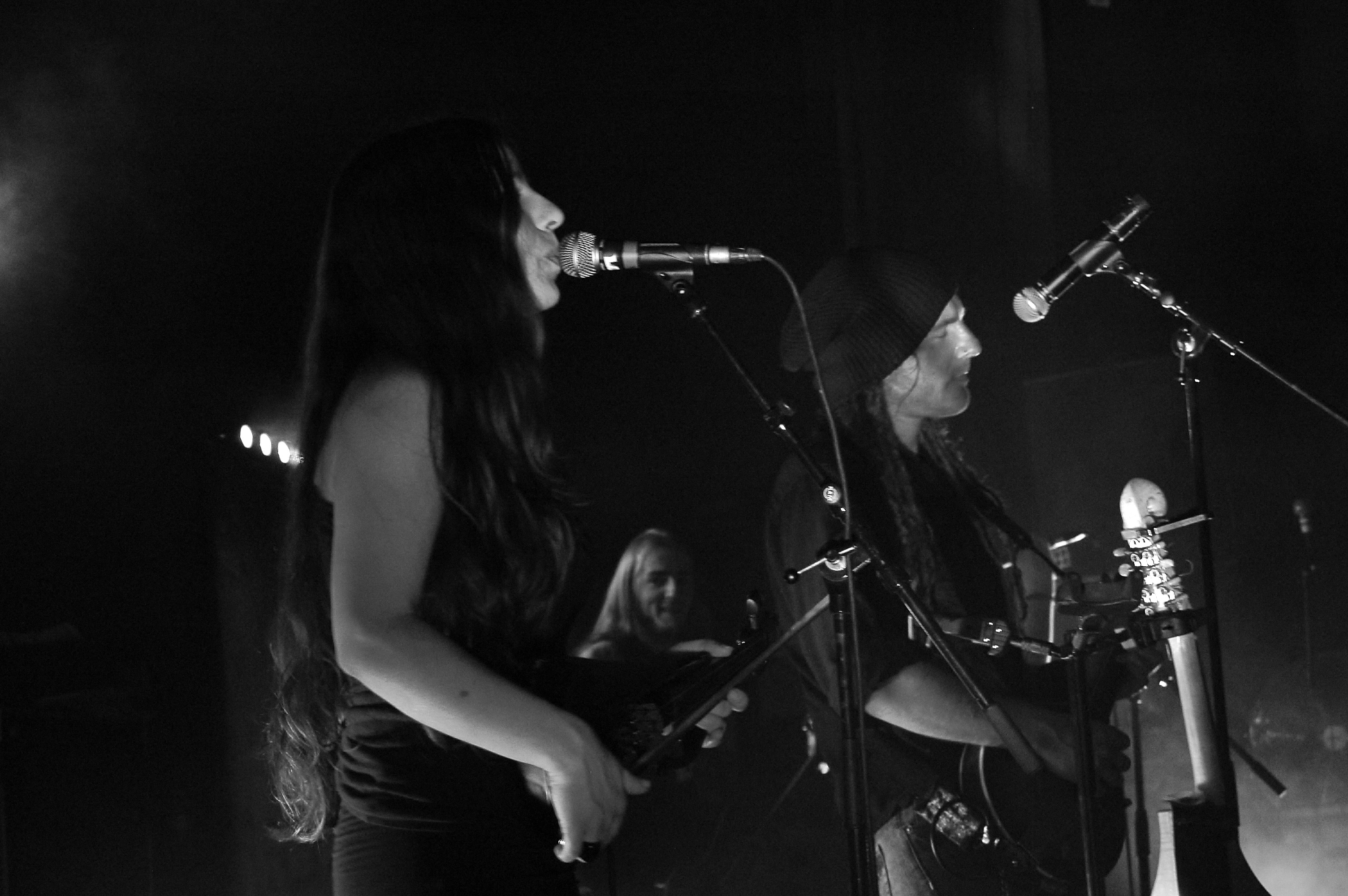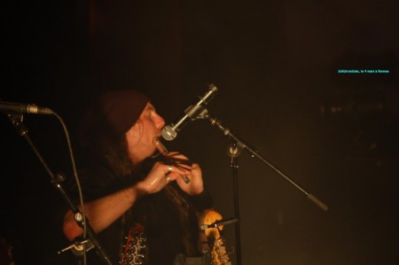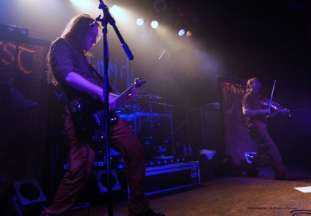 Jochen « Eviga » Stock (chant, guitare) se place à gauche et Thomas « Inve » Riesner au Violon à droite. Les deux se regardent et on a l’impression de rentrer dans un autre monde que celui d’Arkona. Quand le show démarre, la salle se calme. C’est totalement une autre ambiance. Les amateurs de groupe comme Apocalyptica ont été servis, d’autres ne comprenant pas que le Pagan, ce n’est pas que de la violence à tout bout de chant (jeu de mots), quittent la salle. Bien sur, ils ne bougent pas des masses, ils restent assez à leurs places, mais ils sont sérieux, propres, et les riffs se distinguent. Le son reste bon. Au premier rang on peut voir que Jochen se concentre, qu’il est bien plus dans son monde avec sa « gratte » que dans une salle certes, mais pour moi, il essaie de transmettre ce que signifie leur musique. Chant, guitare électrique, guitare classique, basse, il faut tout maîtriser devant un public. Le public en profite pour se poser, peu de pogos, pas de slams. Le violon a une place essentielle, assez à l’ouest vis à vis du reste, toujours assez calme sur une musique qui s’emballe. Mais c’est ça qui est bien justement, ce « décalage » voulu et finalement bien foutu