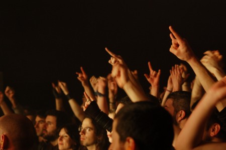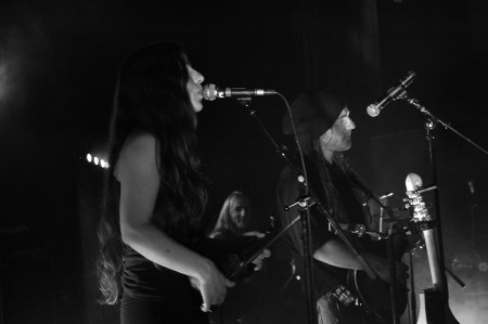 C’est maintenant au tour d’Arkona d’investir les planches du CCO. Emmené par l’énergique Masha et profitant du petit buzz dont il bénéficie chez nous depuis quelques années, le quatuor débute son set sur les chapeaux de russes, s’accaparant rapidement toute l’attention de l’assistance. Et la pression ne retombera pas de sitôt, grâce à la facilité dont fait preuve le groupe pour enchainer les hymnes païens et guerriers, entrecoupés ci et là de quelques danses improvisées au détour d’airs slaves plus traditionnels. Le son est loin d’être mauvais ce soir, et les claviers et autres instruments traditionnels samplés, réputés difficiles à doser, sont bien intégrés à l’ensemble. La trentaine de minutes allouée au set passent finalement très vite, le public répondant à chaque sollicitation de la charismatique chanteuse qui réussi à mettre, avouons-le, une sacrée ambiance dans la fosse.