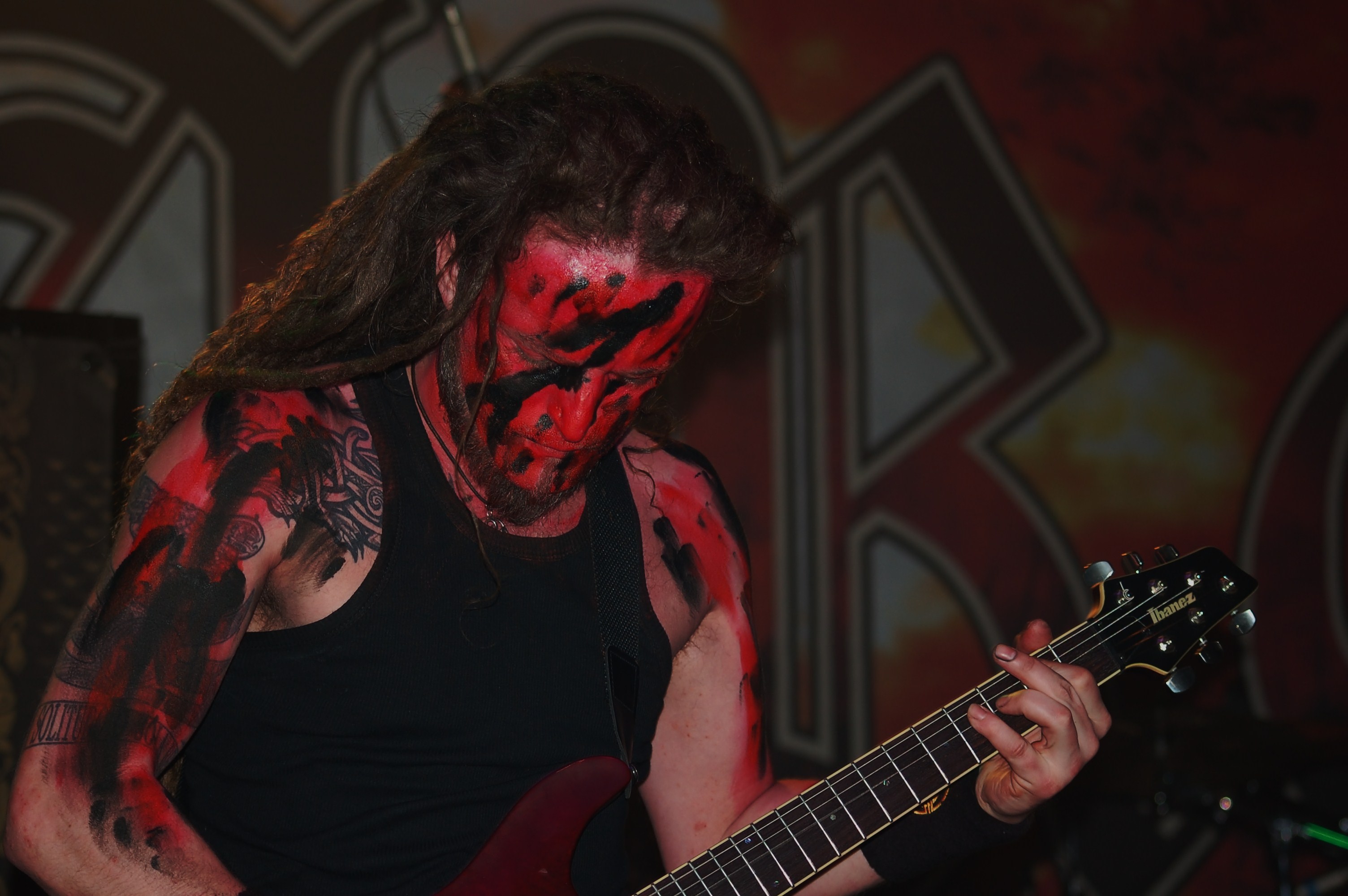 Débarquement dans une salle déjà bien remplie (450 personnes environ) autant par des petits jeunes peinturlurés pour la soirée (et oui, le Pagan, c’est aussi de la peinture sur le corps ;o) que par des habitués un peu plus âgés. Et le groupe allemand Varg prend place… Pour information, Varg est un groupe allemand datant de 2005 (et oui!) qui donne dans le black metal à la sauce pagan. Un groupe qui s’impose direct. Ce qui change dans les couleurs (habituellement le noir et le blanc),c’est le rouge et le noir qui nous surprend. Du fond de la salle, on a l’impression que la scène est plongée dans le sombre avec des jeux de lumières rouges également pour compléter les tenues et le maquillage de tout le groupe. Les moyens sont là en même temps, draps de scène derrière, et deux panneaux devant. Les premières filles commencent déjà à baver. « Bonjour Rennes »… Yeah, les mecs!