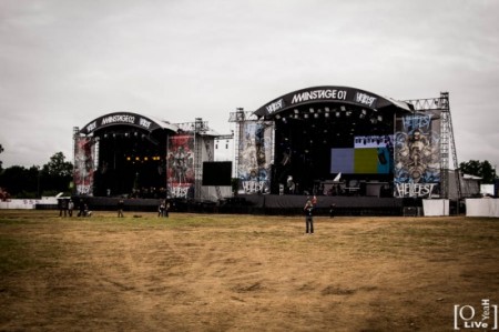 Ayant eu la chance de pouvoir entrer en avance je profite d’un moment rare : personne sur le lieu, tout semble vide et calme alors que les bénévoles s’activent à tout mettre en place avant le déferlement incessant qui ne s’arrêtera que le dimanche âpres le concert de Ghost.