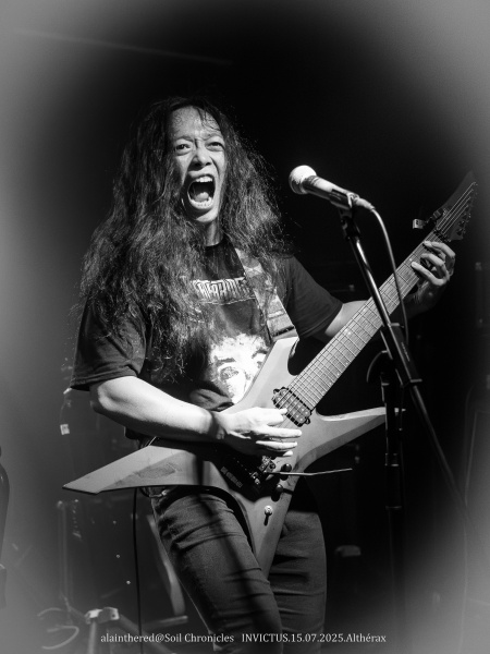 À peine arrivés, il faut déjà sortir les outils pour le shooting de la soirée. Et on commence fort avec les Nippons d’Invictus. Pas de quartier pour ce début de soirée torride : le trio nous balance un death metal old school bien rugueux, saupoudré d’une pointe de thrash qui ne laisse personne indifférent.