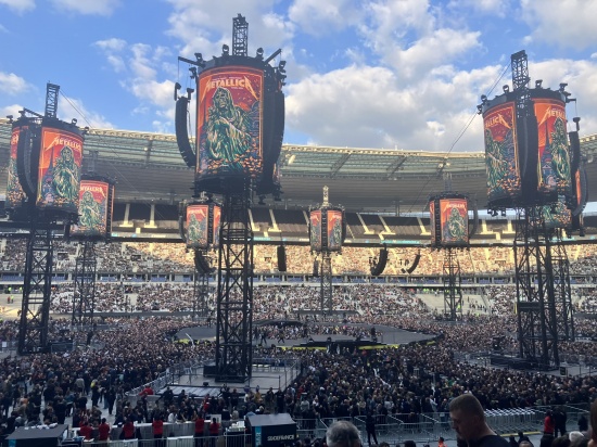 Trois quarts d’heure plus tard, AC/DC résonne dans le stade, avant que « The Ectasy of Gold » (Ennio Morricone) me foute les poils ; et voici enfin les Four Horsemen sur scène, qui nous balancent le triptyque « For Whom The Bell Tolls / Ride the Lightning /Holier Than Thou », puis l’improbable « I Disappear », pour une première partie impeccable. Le son est bon, James, Kirk et Rob tournent autour de l’immense scène centrale, donnant l’occasion à tous de pouvoir constater qu’ils sont en forme, notamment Papa Het, très affûté, même si moins communicatif que par le passé. Les deux concerts fonctionnant en mode miroir, le vendredi commencera tout aussi fort, voire plus, car le stade était plein, avec « Creeping Death », « Harvester of Sorrow », « Cyanide » et « King Nothing ». Concerts divisés en quatre, car quatre kits de batterie jaune pétant, aux quatre coins de la scène pour Lars, lui permettent d’être visible par tous.