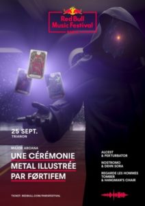 Metal, Red Bull, Tarot… trois mots clés qui me semblaient incompatibles, si bien que ça dépassait mon imagination et je n’arrivais pas à voir ce à quoi allait ressembler ce concept spectacle. Un événement bizarre, avec un descriptif obscur qui laisse vagabonder notre imagination, sans savoir comment tout allait vraiment se passer. J’avoue avoir relu le descriptif plusieurs fois, et à la énième, je n’avais pas la moindre idée du concept. Mis à part qu’il allait y avoir des illustrations et animations pendant chaque set et que c’était une grande messe de metal français (enfin presque, Nostromo sont suisses) !