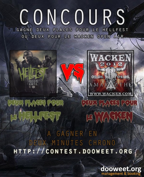 L’association Dooweet organise un concours permettant de gagner 2 pass trois jours pour le Hellfest et 2 places pour le Wacken. A savoir qu’en plus le déplacement est pris en charge.