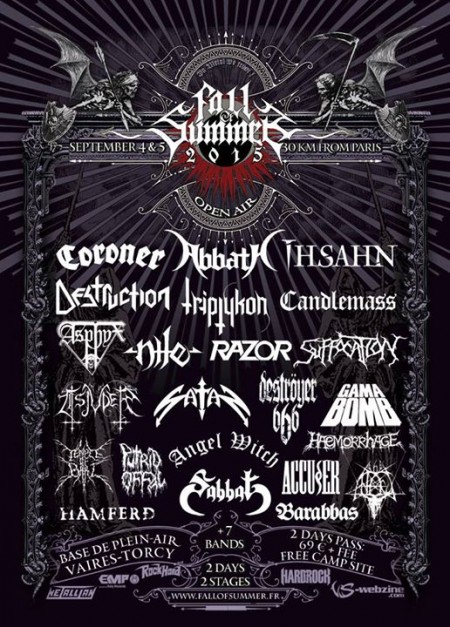 L’équipe du Fall of Summer est fière de vous annoncer que les thrasheurs suisses de CORONER reviendront faire un tour en région parisienne pour la première fois depuis leur concert de 1996 au Club Dunois. Se joignent également à l’affiche l’Antéchrist australien DESTRÖYER 666, les thrasheurs irlandais de GAMA BOMB, les chirurgiens espagnols du Goregrind HAEMORRHAGE, ainsi que les Français de PUTRID OFFAL, pour leur première date française après 20 ans d’absence !
