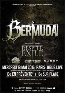 -BERMUDA + DESPITE EXILE + CHILD OF WASTE + FRCTRD + NAKHT @Gibus Live (Paris) Depuis 2009 les californiens de BERMUDA se sont imposés comme l’un des nouveaux groupes deathcore à suivre de près. Malgré ses nombreux changements de line-up la formation ne s’est pas laissée abattre et a sorti « Use Your Burdens » en décembre et s’apprête à le présenter au monde entier en sillonnant les routes ! L’un des groupes les plus prometteurs de deathcore italien se nomme DESPITE EXILE. « Disperse », leur dernier EP, vient confirmer leur envie de faire partie de la même lignée que leurs ainées de Whitechapel ou encore Veil Of Maya !