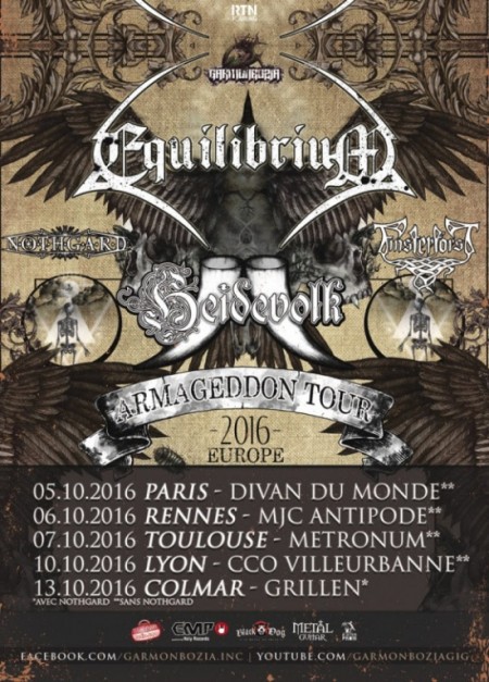 -Nouvel album d’Equilibrium ‘’Amargeddon’’ prévu pour le 12 Aout 2016 et une tournée européenne est annoncée avec Heidevolk, Finsterforst et Nothgard avec 5 dates françaises ( Nothgard ne sont pas présent sur les dates françaises) : Paris au Divan du Monde ( 5 Octobre 2016),Rennes à L’Antipode ( 6 Octobre 2016),Toulouse au Metronum ( 7 Octobre 2016), Lyon au CCO ( 10 Octobre 2016) et Colmar au Grillen ( 13 Octobre 2016)