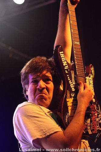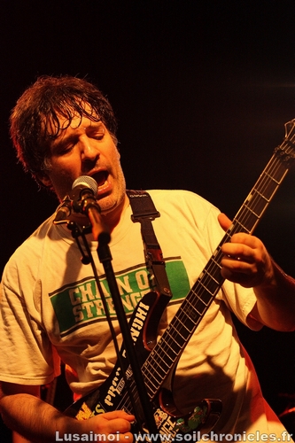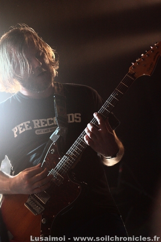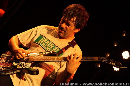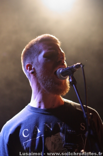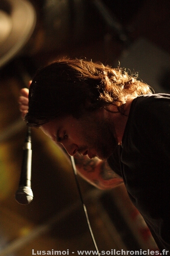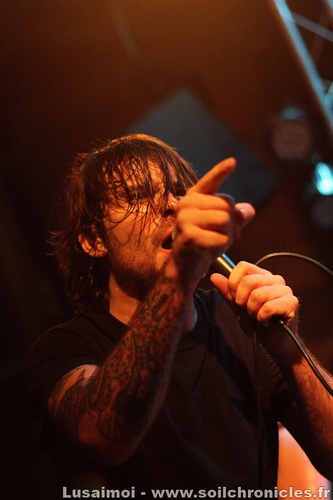 Et comme la soirée n’a fait que s’amplifier au fil des groupes, c’est tout naturellement qu’on en attend le clou. Shai Hulud, qui vraiment, compte en découdre, soutenu par quelques fans au premier rang qui pourraient remplacer le chanteur, tant ils connaissent les paroles par cœur. Chanteur qui ne se privera pas d’en jouer, leur passant le micro régulièrement. Quant au reste, entre un bassiste tout en rage, un premier guitariste heureux d’être là et un deuxième aux poses et mimiques folles, il n’y avait plus de place pour l’ennui. Leur musique, plus complexe et barrée que la majeure partie de la scène (ces gars savent jouer avec les clichés du Hardcore pour mieux les détourner), n’empêche pas le public de gigoter (même si le véritable bordel ne sera pas pour ce soir, ce qui n’est pas un mal, compte tenu de la taille restreinte de la salle), et le tout devient de plus en plus fou à mesure que le set avance, si bien que la fin arrivera bien vite.
